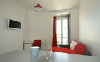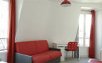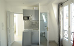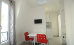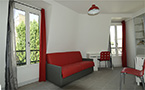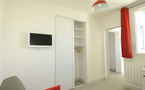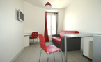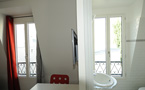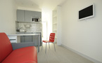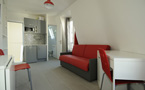 Sol en granit clair, living avec une grande fenêtre, double vitrage, voilages et rideaux occultants, radiateurs à inertie, bibliothèque, placards, penderie, TV écran plat, coin bureau, cuisine américaine entièrement aménagée avec crédence en pâte de verre, plaques de cuisson, réfrigérateur, micro-onde grill, ustensiles de cuisine et couverts, passe-plats et coin repas.