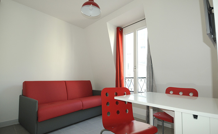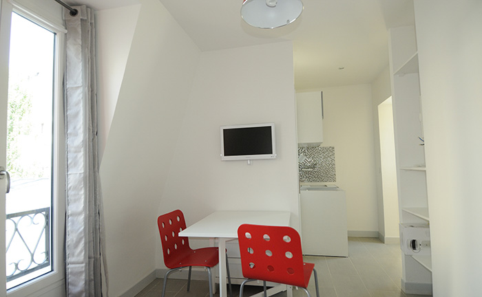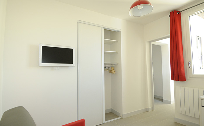Living avec une grande fenêtre, double vitrage, voilages et rideaux occultants, radiateurs à inertie, bibliothèque, placards, penderie, TV écran plat. Coin-repas avec table à abattant.